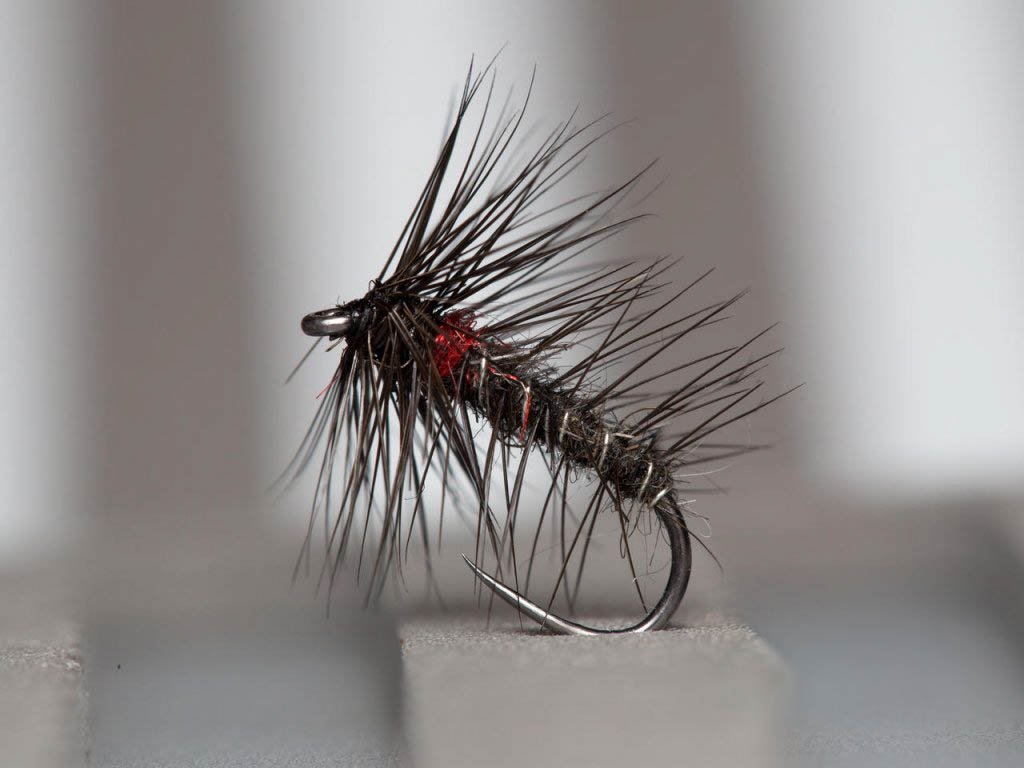 Black & Red Dry Bibio. Classic fly ideal for fishing on lakes or in river riffles. Also great to use in hopper / dropper combo due to dense body hackle which will easily carry small nymph on dropper.