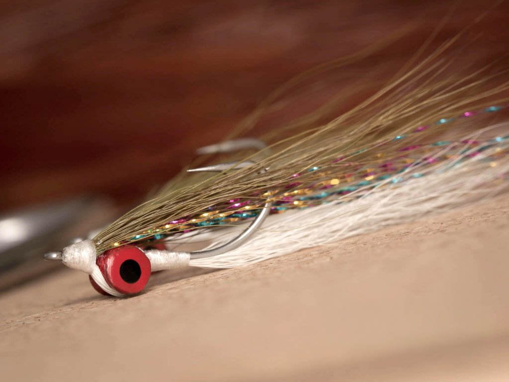 Clouser Minnow Streamer - White Olive. The Clouser Minnow is a fly pattern developed by Bob Clouser, a renowned fly tyer and fly fisherman. It is a very popular fly pattern used for catching various types of fish, especially game fish such as bass, trout, and pike. The Clouser Minnow is a simple, yet effective, streamer pattern that imitates a small baitfish. It is tied with a weighted head and a slim profile body, which allows the fly to sink quickly and swim realistically through the water. The head of the fly is tied with lead dumbbell eyes to provide weight and to keep the fly oriented in a downward position.