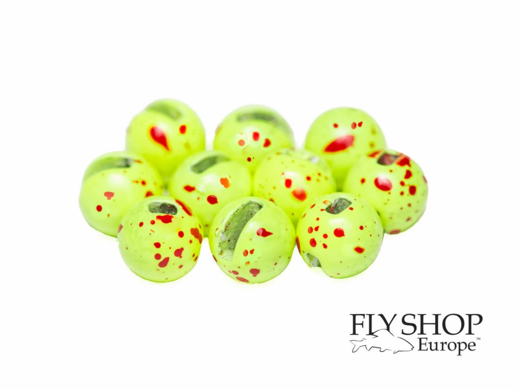 FS Europe Slotted Tungsten PLUS Beads Small Slot - Mottled Chartreuse Red are extra heavy beads with a slim slotted hole. Perfect for competition fly fishing where extra weight per diameter is even more important.