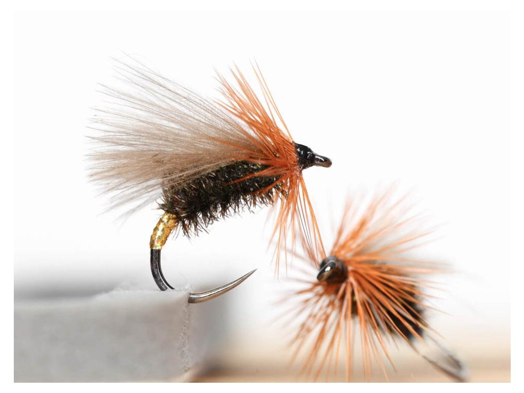Gold Black Coch-Y-Bonddu Dry Fly. Very good floating caddis / sedge dry fly pattern fished as a single fly or in duo setup. Combination of genetic rooster hackle and CDC wing makes it float perfectly. This dry fly sits higher on the water surface and therefore is great to fish in riffles, rough waters, etc. Can imitate various types of sedge caddis flies or bugs living on the river bank.