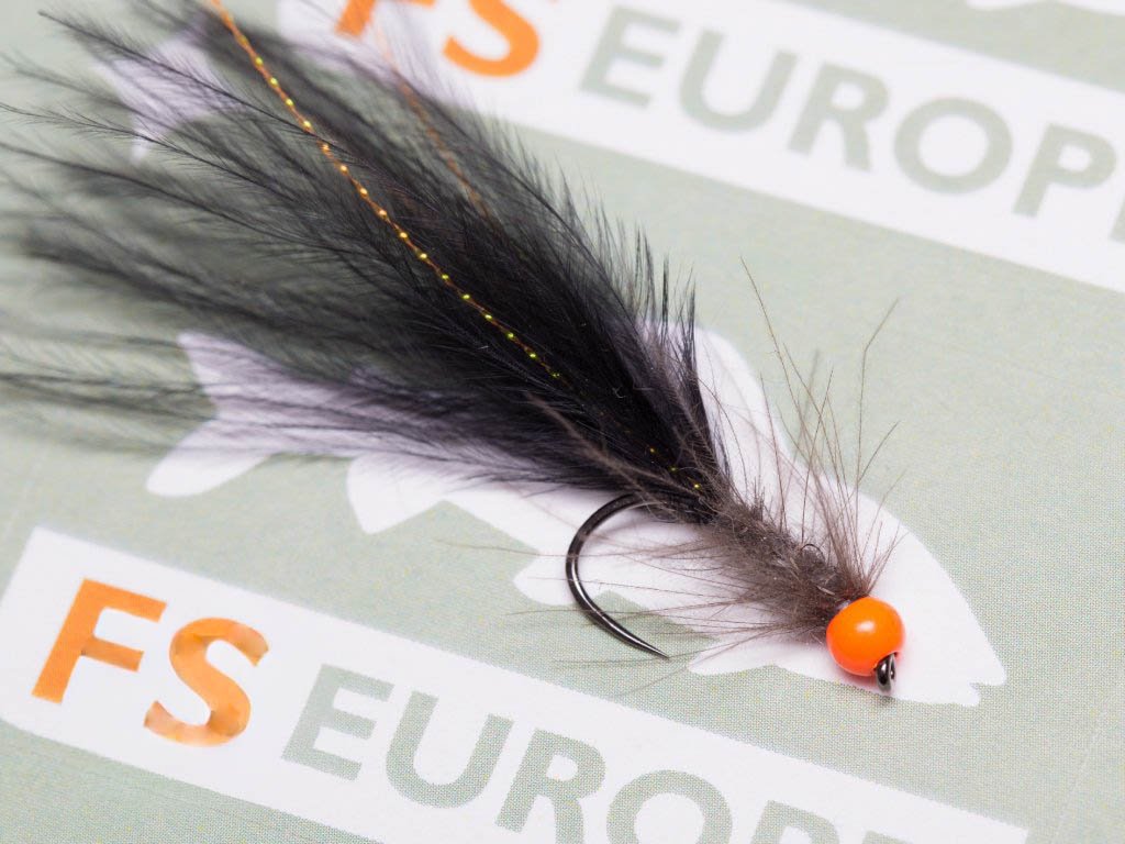 Grey Black Egg Sucking Leech. Tail made from marabou feathers and body dubbed with natural grey hare dubbing, palmered with CDC. Fluo orange tungsten / brass bead. Great lake / river lure.