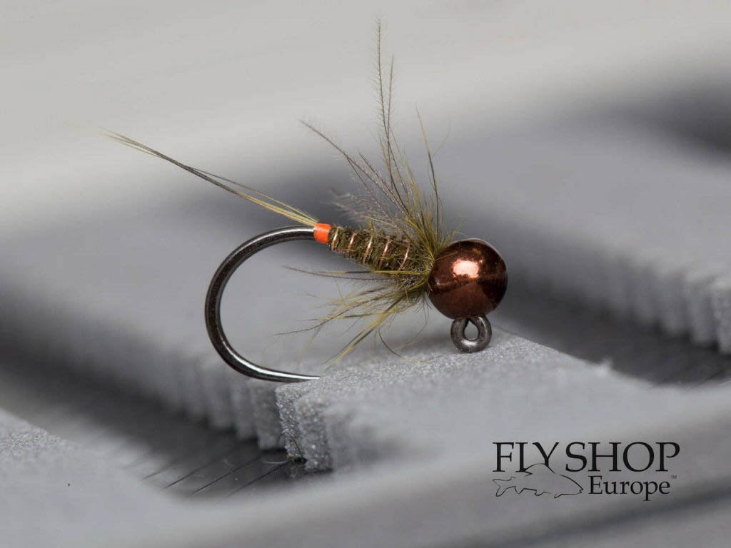 Olive Jig Nymph - Coffee Special. Olive Jig Nymph variant tied on a barbless jig hook. Great fly for brown trout and grayling. Coffee tungsten bead in combination with fine copper wire and buggy olive body works well. Available in various sizes / weights. Barbless with a tungsten bead.