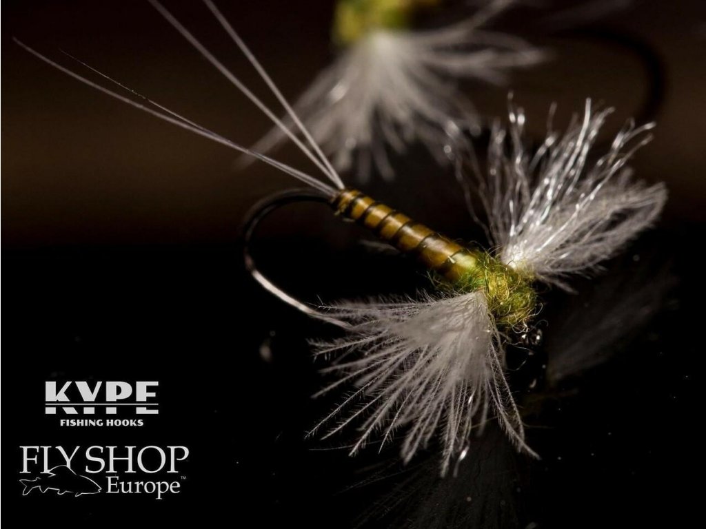 Olive Spinner Dry Fly. Great olive dry fly for selective grayling and also trout. CDC wing mixed with floating yarn in V shape and long fine tail leaves a perfect footprint on the water surface.