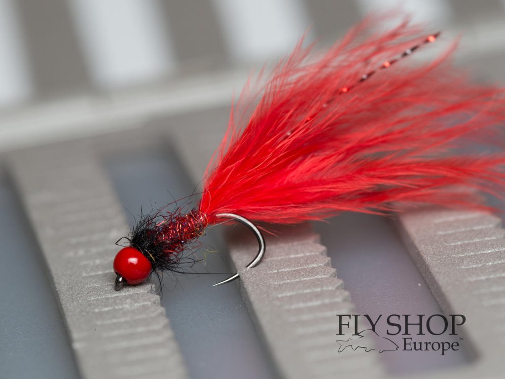 Red Marabou Leech. Tail made from marabou feathers and body dubbed with spectra dubbing. SLF squirrel in thorax. Light version (without the bead) works great on lakes. Heavier version (with tungsten bead) is more suitable as a point fly, ideal for river fishing in strong currents.