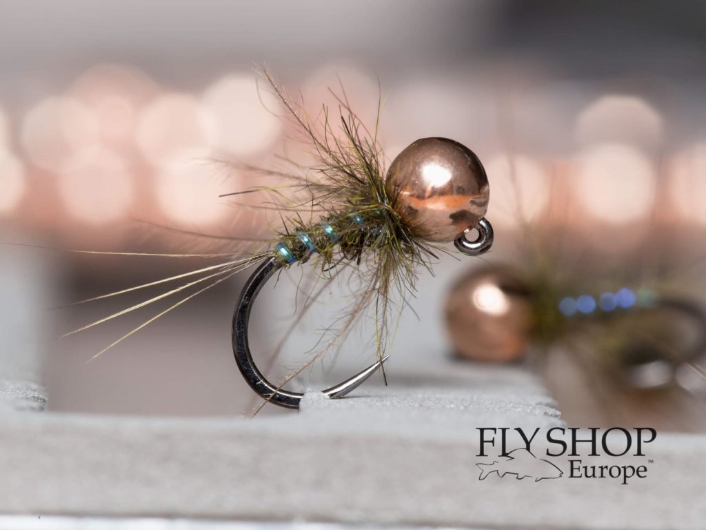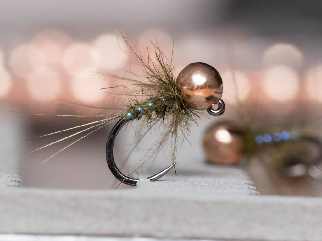 Heavy Olive Nymph - Copper Bead. Heavy and small olive jig nymph pattern. Oversized tungsten slotted bead will get your fly quickly to the bottom where fish are feeding. Fly sinks like a rock and CDC movement induces strikes! Strong peacock blue green ribbing adds just the right amount of flash.