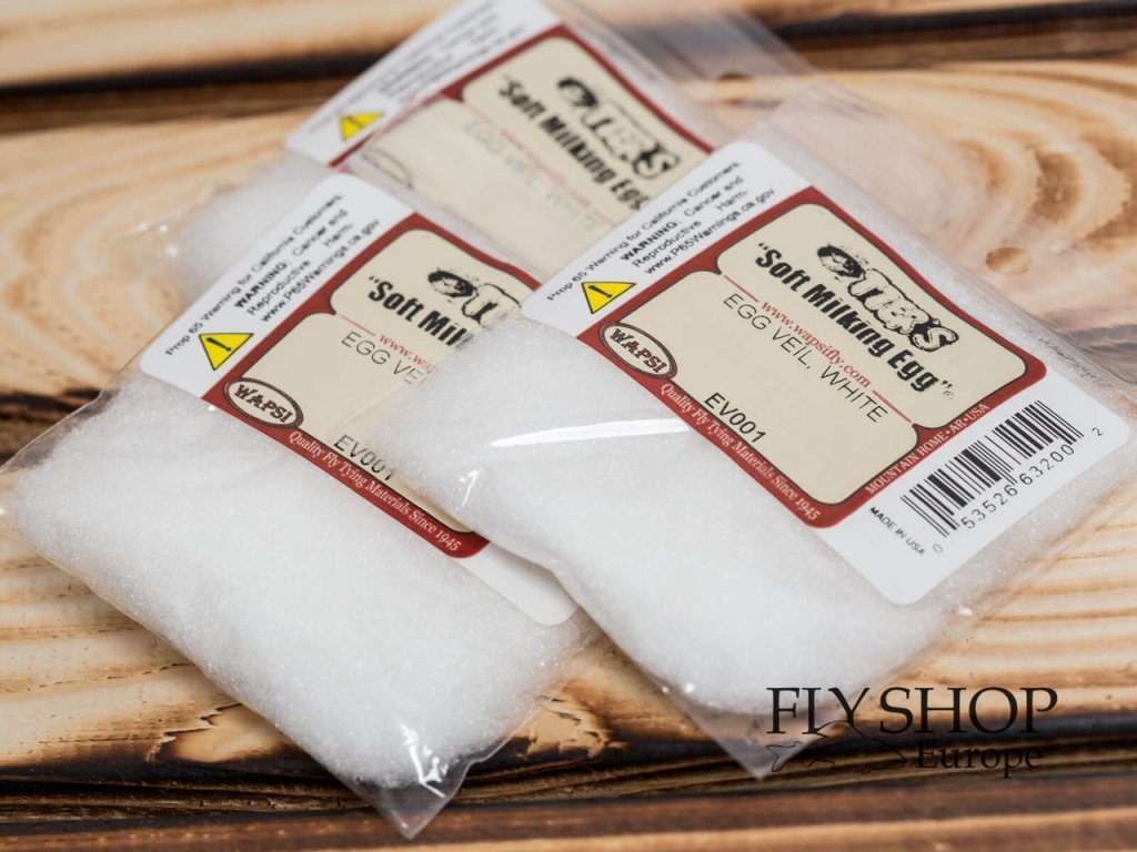 Wapsi Egg Veil. Many anglers are finding that the fish in their local streams have become conditioned to seeing rigid, unrealistic egg fly patterns and have learned to avoid them. This is why it is important that the angler make an effort to match the color and appearance of the natural eggs more closely. Egg Veil is a milky white colored, fine denier, Antron® yarn that mimics the natural translucency and appearance of a milking egg drifting in the current. Egg Veil is also useful for parachute posts on small dry flies, spinner wings, and for use on midge pupae fly patterns.