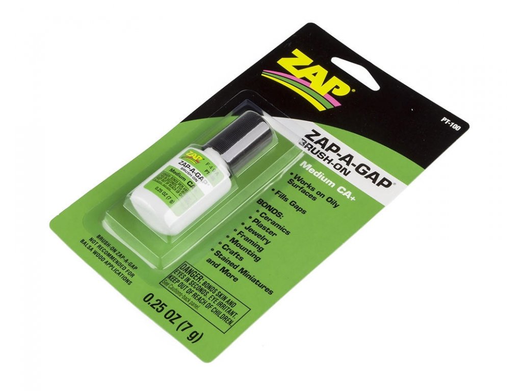 Zap-A-Gap Brush On Super Glue - Medium. A powerful super glue of medium viscosity that will set in 5-10 seconds and bonds quickly to materials. Each bottles contains 7 g of glue and comes with a convenient brush. Packed in blister.
